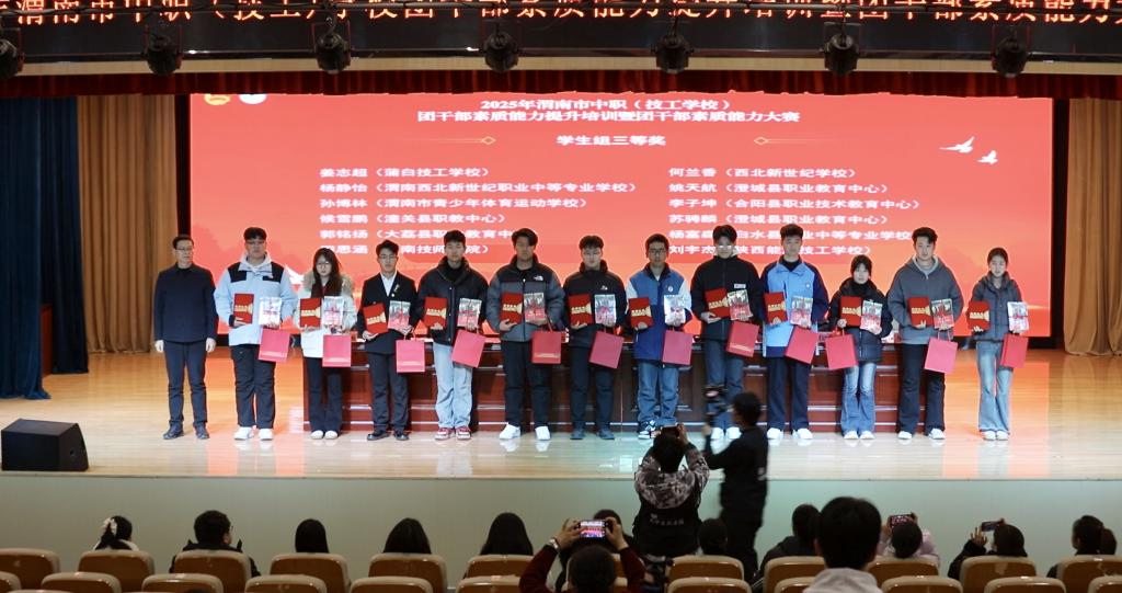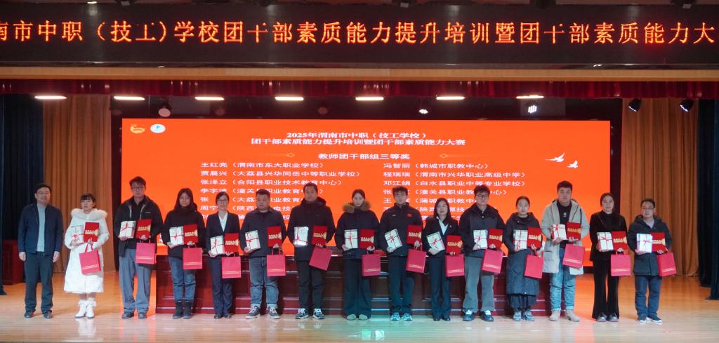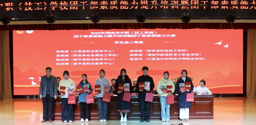12月25日,2025年渭南市中职(技工)学校团干部素质能力大赛在我校圆满落幕。本次大赛由共青团渭南市委、渭南市教育局、渭南市人力资源和社会保障局、渭南职业教育集团联合主办,我校作为承办单位,得到了共青团陕西省委、陕西省教育团工委的悉心指导。本次大赛旨在搭建团干部交流学习、展示风采的平台,全面提升中职(技工)学校团干部的政治素养、业务能力和实践水平。